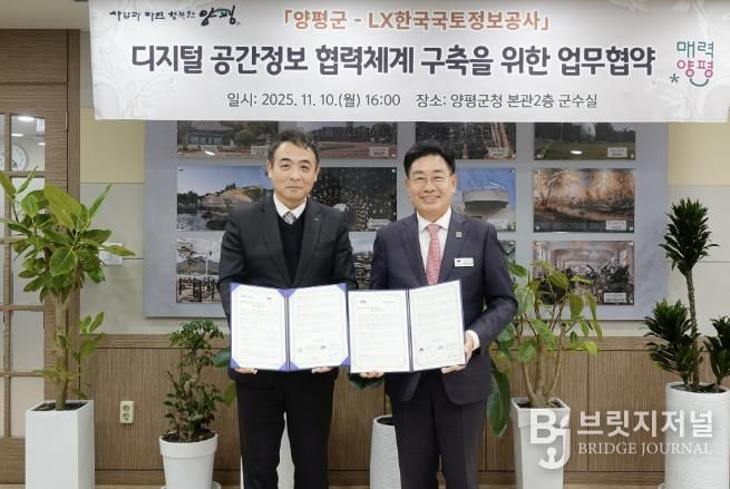 브릿지저널 김경미 기자 | 양평군은 지난 10일 LX한국국토정보공사와 ‘디지털 공간 정보 협력체계 구축을 위한 업무협약(MOU)’을 체결하고, 군민이 체감할 수 있는 스마트 행정 서비스 확대에 나섰다.