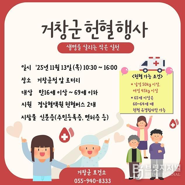 브릿지저널 김경미 기자 | 거창군은 오는 13일 오전 10시 30분부터 오후 4시까지 거창군청 앞 로터리에서 ‘2025년 마지막 생명나눔 헌혈 행사’를 실시한다.