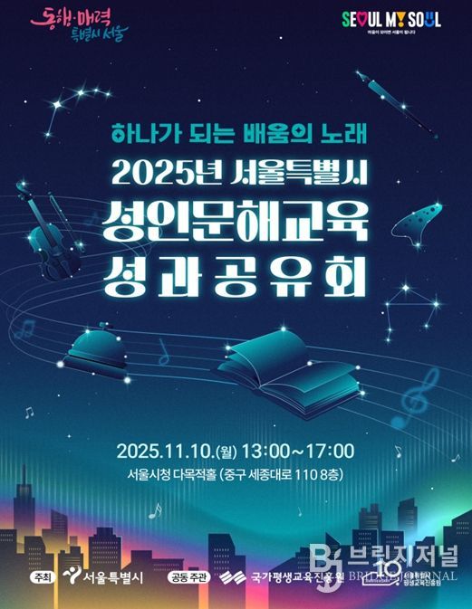 브릿지저널 김경미 기자 | 서울시평생교육진흥원은 ‘하나가 되는 배움의 노래’를 주제로 10일 13시부터 17시까지 서울시청 본청 8층 다목적홀에서 ‘2025년 서울시 성인문해교육 성과공유회’를 개최했다. 이번 행사는 성인 문해학습자들이 한 해 동안의 학습 여정에서 얻은 경험과 결실을 나누고, 새로운 배움에 대한 열망을 확인하는 장으로 마련됐다.