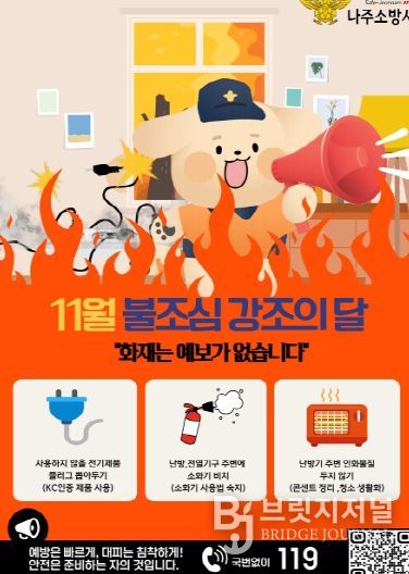 브릿지저널 김경미 기자 | 나주소방서(서장 신향식)는 겨울철을 앞두고 화재 발생 위험이 높아지는 시기에 맞춰 ‘11월 불조심 강조의 달’을 운영하여 시민 모두가 함께 실천하는 안전한 난방·전기 화재 예방을 당부했다.