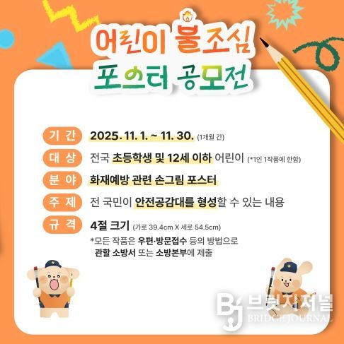 브릿지저널 김경미 기자 | 해남소방서가 11월 불조심 강조의달을 맞아 이달 21일까지 지역 내 초등학생 및 12세 이하 어린이를 대상으로 불조심 포스터 공모전을 개최한다.