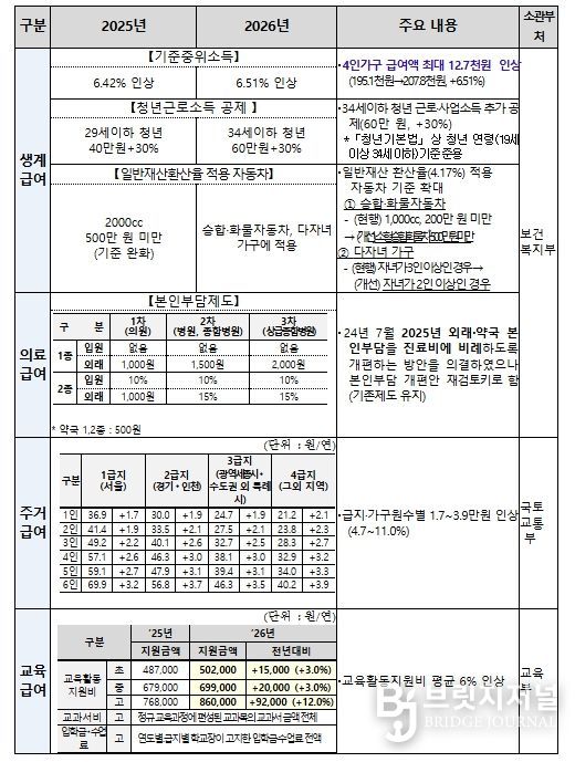 브릿지저널 정보영 기자 | 2026년부터 기초생활보장 생계급여가 1인 가구 기준 월 최대 5만 5,000원, 4인 가구는 월 최대 12만 7,000원 늘어난다. 기준 중위소득 인상률이 역대 최고 수준을 기록하면서 저소득층 복지 지원이 대폭 강화되기 때문이다.