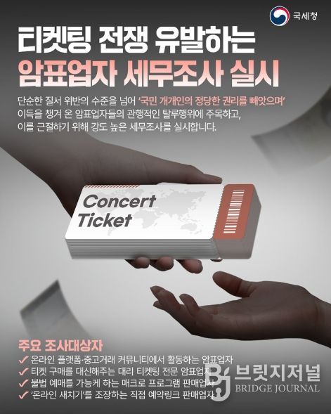 브릿지저널 김경미 기자 | 단순한 질서 위반의 수준을 넘어 '국민 개개인의 정당한 권리를 빼앗으며' 이득을 챙겨 온 암표업자들의 관행적인 탈루행위에 주목하고, 이를 근절하기 위해 강도 높은 세무조사를 실시합니다.
