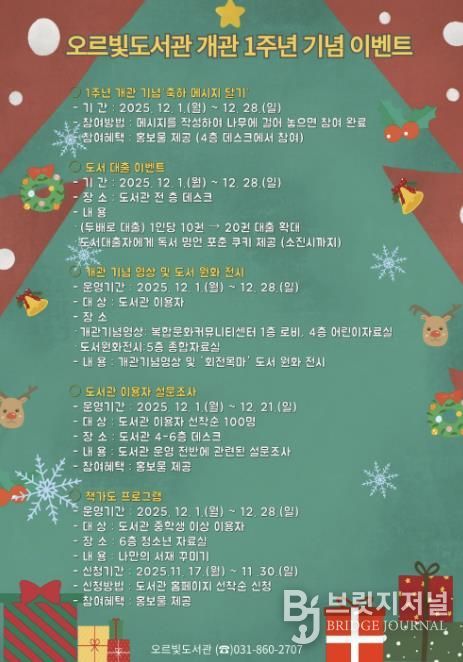 브릿지저널 김경미 기자 | 동두천시 오르빛도서관이 개관 1주년을 맞아 12월 한 달간 다채로운 문화행사를 진행한다. 오르빛도서관은 지난해 12월 개관 이후 시민들의 높은 관심 속에 지역 대표 독서문화 공간으로 자리매김해왔다.