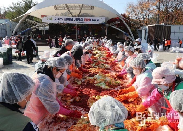 브릿지저널 김경미 기자 | (사)경기도여성단체협의회 김포시지회가 지난 11일 사우문화체육광장에서 ‘한마음 사랑의 김장나누기’ 행사를 성황리에 개최했다. 행사에 격려하기 위해 참석한 김병수 김포시장은 직접 배추를 버무리며 이웃사랑 실천에 동참하고, 이웃돕기를 위해 헌신하는 여성단체 회원들과 자원봉사자들에게 감사의 뜻을 전했다.