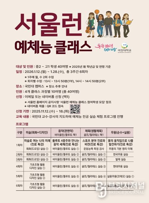브릿지저널 김경미 기자 | 서울시가 예체능 계열에 관심과 재능이 있지만 높은 사교육비가 부담돼 진로 탐색 기회를 얻지 못하는 취약계층 청소년을 위해 대학에서 전공 실습 수업을 받아보는 ‘서울런 예체능 클래스’를 마련한다. 참여 학생들은 1월 12일~1월 28일 국민대학교 캠퍼스에서 과정별 무료로 클래스에 참여하게 된다.