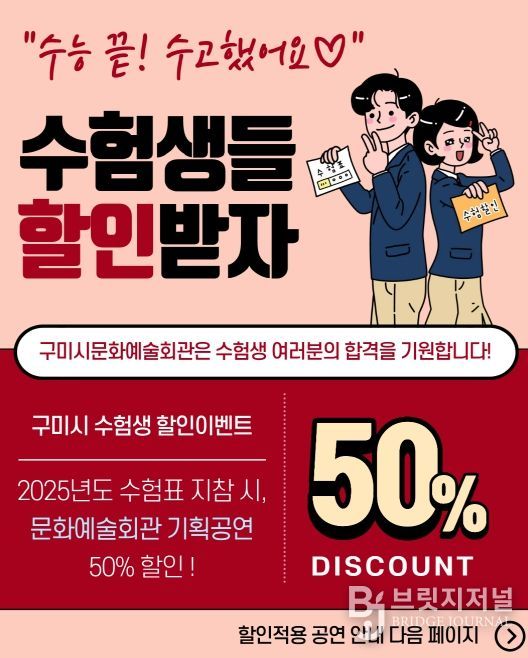 브릿지저널 정보영 기자 | 구미시는 2025학년도 대학수학능력시험을 마친 수험생들을 위해 ‘수험생 특별할인 이벤트’를 진행한다.