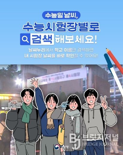 브릿지저널 김경미 기자 | 날씨누리에서 학교 이름만 검색하면 내 시험장 날씨를 바로 확인할 수 있어요!