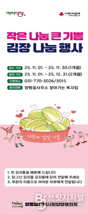 브릿지저널 김경미 기자 | 양평군 양평읍은 11월 1일부터 12월 31일까지 두 달간 ‘작은 나눔, 큰 기쁨 김장 나눔 사업’을 추진하며, 관내 취약계층 이웃들에게 정성 가득한 김장김치를 전달한다고 밝혔다.