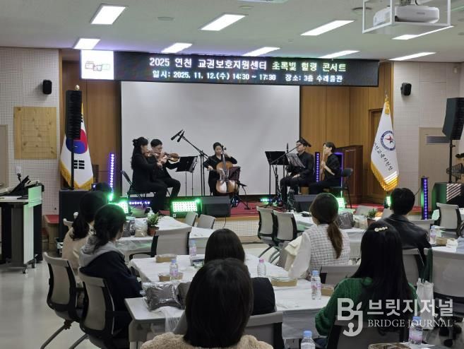 브릿지저널 김경미 기자 | 경기도연천교육지원청 교권보호지원센터는 2025년 11월 12일 연천교육지원청 3층 수레울관에서 교원의 정서 회복과 마음 치유를 위한 '초록빛 힐링 콘서트'를 진행했다.