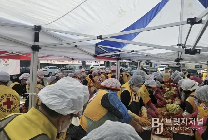 브릿지저널 김경미 기자 | 대한적십자사 시흥시협의회는 지난 11월 13일 ‘사랑의 김장 담기’ 행사를 열고 지역 내 소외된 이웃들에게 온정을 전했다. 이번 행사에는 대한적십자사 시흥시협의회 봉사원 100여 명이 참여해 정성껏 김장김치를 담갔으며, 완성된 김치는 관내 저소득가정 등 약 300가구에 전달됐다.