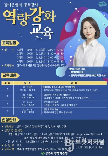 브릿지저널 정보영 기자 | 상주시는 11월 17일부터 11월 28일까지‘2025년 강사은행제 등록강사 역량강화 교육’수강생 70명을 모집한다.