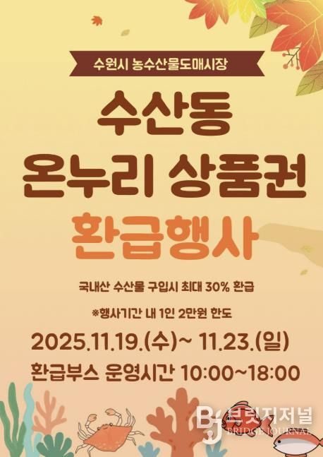 브릿지저널 김경미 기자 | 수원시농수산물도매시장 수산동이 11월 19일부터 23일까지 온누리상품권 환급 행사를 연다. 행사 기간에 국내산 수산물을 구매하면 최대 2만 원을 온누리상품권으로 환급받을 수 있다.