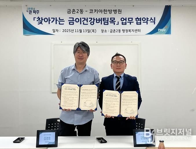 브릿지저널 김경미 기자 | 파주시 금촌2동은 지난 13일 관내 의료기관인 코키아한방병원과 함께 복지사각지대 해소 및 맞춤형 복지 서비스 제공을 위한 ‘찾아가는 금이건강버팀목’업무협약을 체결했다고 밝혔다.