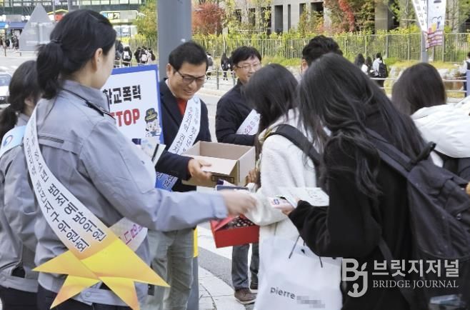 브릿지저널 김경미 기자 | 법무부 청소년범죄예방위원 수원지역 권선지구위원회는 지난 11일, 수능을 앞두고 영신여자고등학교 하굣길에 수원권선경찰서 및 구 공무원 등 30여 명과 함께 학교폭력예방 합동 캠페인을 진행했다.