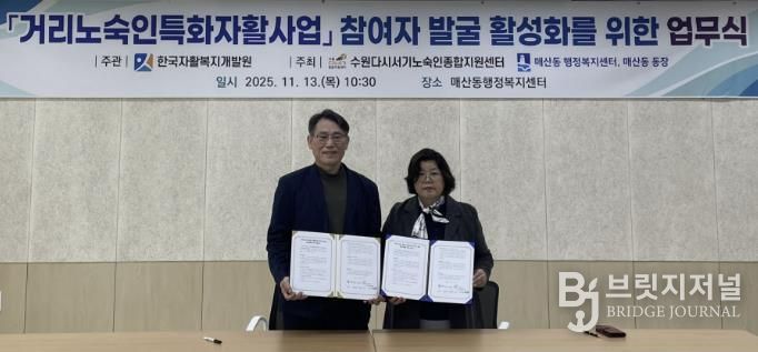 브릿지저널 김경미 기자 | 수원시 팔달구 매산동과 수원다시서기 노숙인종합지원센터는 지난 13일, 거리노숙인들의 안정적인 사회 복귀를 지원하기 위해 ‘거리노숙인 특화 자활사업 참여자 발굴 활성화를 위한 업무협약(MOU)’을 체결했다.