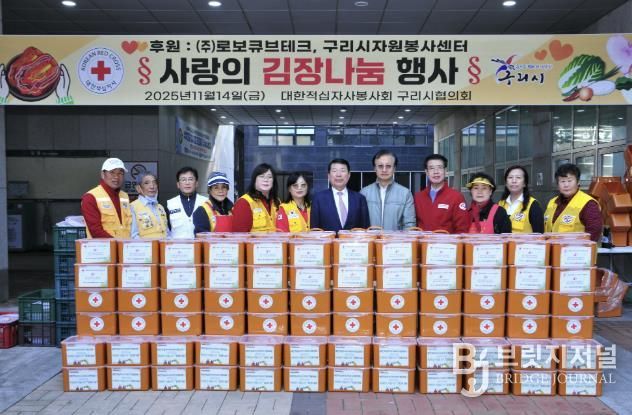 브릿지저널 김경미 기자 | 구리시는 11월 14일 수택3동 행정복지센터에서 대한적십자사 봉사회 구리시 협의회 주관으로 ‘2025년 사랑의 김장 나눔’ 활동과 ㈜로보큐브테크 지정기부금 전달식을 개최했다고 밝혔다.