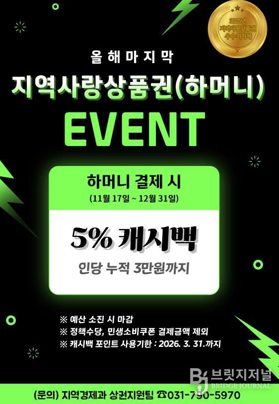 브릿지저널 김경미 기자 | 하남시는 연말 소비 활성화를 위해 오는 11월 17일부터 12월 31일까지 지역사랑상품권 ‘하머니’ 결제 금액의 5%를 캐시백 형태로 환급하는 이벤트를 진행한다.