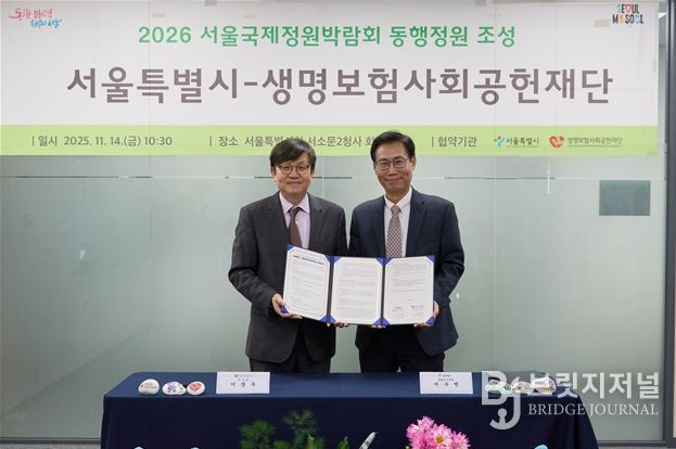 브릿지저널 김경미 기자 | 서울시는 생명보험사회공헌재단과 11월 14일 업무협약을 맺고 2026년 서울숲에서 개최되는 서울국제정원박람회에 동행정원을 조성한다고 밝혔다. 이로써 내년 서울숲에서는 ‘마음의 전화’를 갖춘 ‘마음정원’을 만나볼 수 있게 된다.