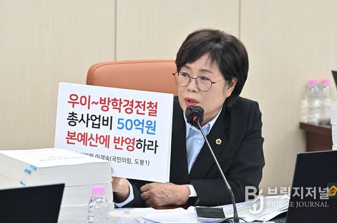 브릿지저널 김경미 기자 | 국민의힘 이경숙 서울시의원(도봉1)은 13일 도시기반시설본부 안대희 본부장을 대상으로 한 현안 질의를 통해 2026년도 본예산에 우이신설 연장선 총사업비 50억 원을 반영하고, 이를 매칭할 시비를 적기에 확보할 것을 강력히 촉구했다.