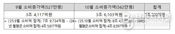 한편, 9·10월 환급(페이백) 지급 대상자(중복 포함, 1,089만명)가 작년 월평균 카드 소비액보다 총 7조 220억원을 더 지출한 것으로 확인됐다. 이는 지급액(6,430억원)의 11배에 달하는 규모다.