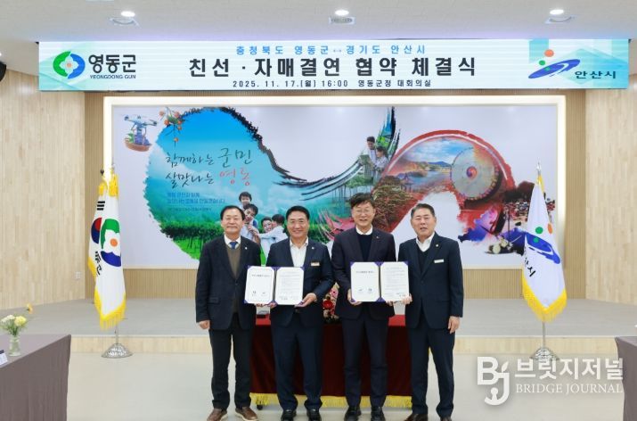 브릿지저널 김경미 기자 | 17일 오후, 충청북도 영동군청에서 영동군과 경기도 안산시(시장 이민근) 간의 자매결연 협약 체결식이 진행됐다.