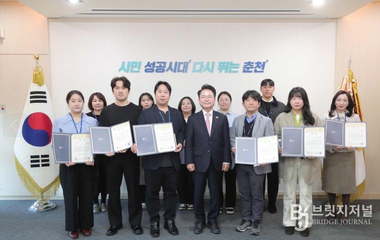 브릿지저널 윤나영 기자 | 청렴문화 확산에 기여한 춘천시 직원들을 위한 ‘2025 청렴리더상 시상식’이 18일 열렸다. 육동한 춘천시장은 이날 시청 접견실에서 청렴 우수 부서 소속 직원(청렴리더) 11명에게 상장을 수여했다.
