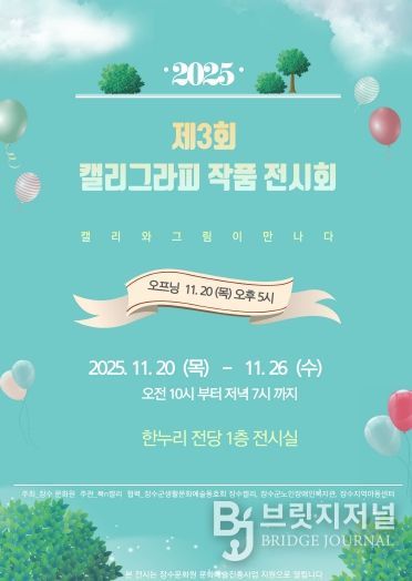 이번 전시는 장수문화원이 주최하고 북n캘리가 주관했으며, 장수군생활문화예술동호회 장수캘리, 장수군노인장애인복지관, 장수지역아동센터가 협력해 진행된다.