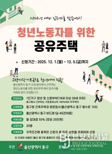 브릿지저널 윤나영 기자 | 울산 동구는 동구 지역에서 근무하는 무주택 청년의 주거 안정을 위해 조성한 ‘청년 노동자 공유주택’의 2026년 입주 예비 입주자를 오는 12월 1일부터 5일까지 모집한다.