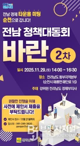 브릿지저널 김경미 기자 | 전라남도는 29일 동부지역본부에서 경제 타운홀 미팅인 ‘전남 청책대동회 바란(2차)’을 개최키로 하고 21일까지 정책 제안서를 받는다고 밝혔다.
