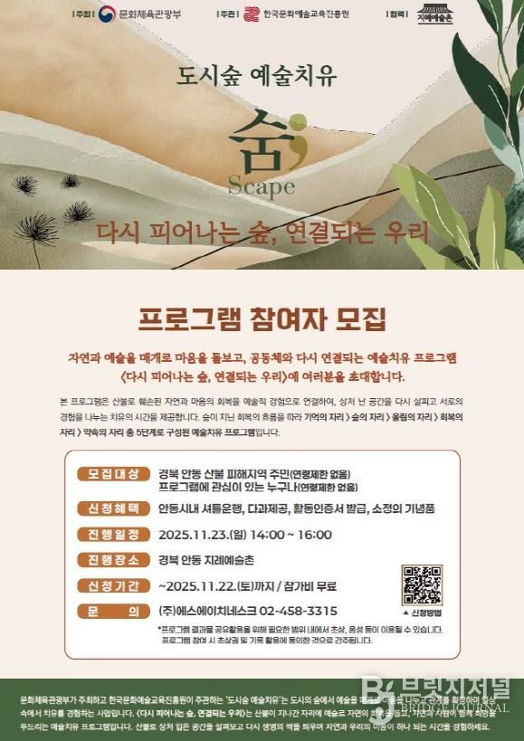 한국문화예술교육진흥원 관계자는 “이번 프로그램은 산불 피해로 상처 입은 숲을 다시 일으켜 세우기 위한 마음을 모으는 자리”라며, “자연과 예술이 함께하는 특별한 경험을 통해 시민들이 회복과 위로의 시간을 갖게 되길 바란다”고 말했다.