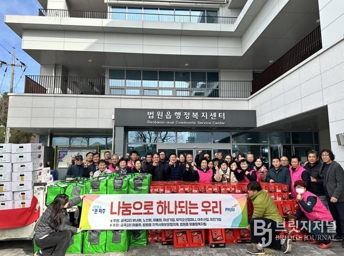 브릿지저널 김경미 기자 | 파주시 법원읍 금곡2리 마을회는 지역사회 나눔 확산을 위해 지난 17일, 법원읍 행정복지센터에서 관내 기업인 뮤직오션컴퍼니, 미성기업, 유진기업과 함께 참여한 겨울맞이 이웃 돕기 나눔 행사를 진행했다.