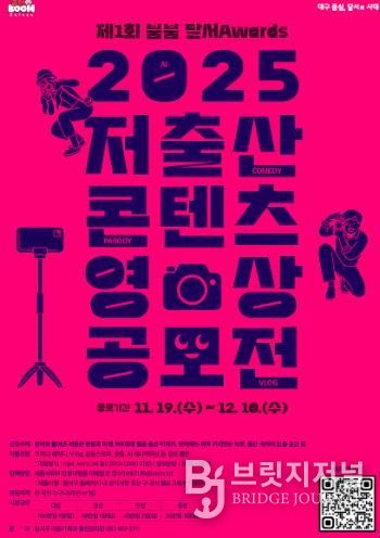 브릿지저널 김진석 기자 | 대구 달서구는'출산BooM 달서'프로젝트 일환으로 MZ 청년세대의 저출산 긍정 인식 확산과 참여형 홍보를 위해‘제1회'출산BooM 달서'저출산 콘텐츠 영상 공모전’을 개최한다.