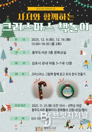 브릿지저널 김경미 기자 | 김포시 풍무도서관은 ‘사서와 함께하는 크리스마스 책놀이’프로그램을 12월 9일과 16일 오후 3시부터 4시 30분까지 운영한다.