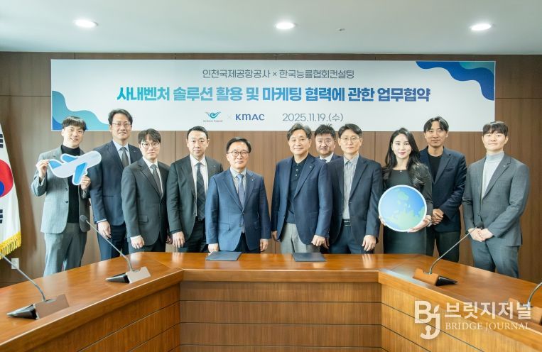 브릿지저널 김경미 기자 | 인천국제공항공사(사장 이학재)는 19일 오전 공항청사 회의실에서 한국능률협회컨설팅(KMAC)과 ‘인천공항 사내벤처 솔루션* 활용 및 마케팅 협력을 위한 업무협약(MOU)’을 체결했다고 밝혔다.
