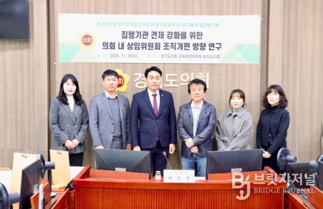 브릿지저널 김경미 기자 | 경기도의회 자치분권발전위원회 총무행정분과 이은주 위원장(국민의힘, 구리2)은 11월 19일, 「집행기관 견제 강화를 위한 의회 내 상임위원회 조직개편 방향 연구」 중간보고회를 주재했다. 이번 회의는 지난 9월 29일 열린 착수보고회 이후 연구 추진 경과를 점검하고, 향후 연구 방향을 구체화하기 위해 마련됐다.