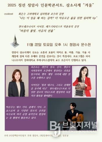 브릿지저널 윤나영 기자 | 정선 정암사는 오는 11월 22일 오후 1시, 천년 고찰 정암사 문수전에서 ‘2025 정암사 인문학콘서트 삼소사계 – 겨울’을 열고, 한 해의 여정을 마무리한다.