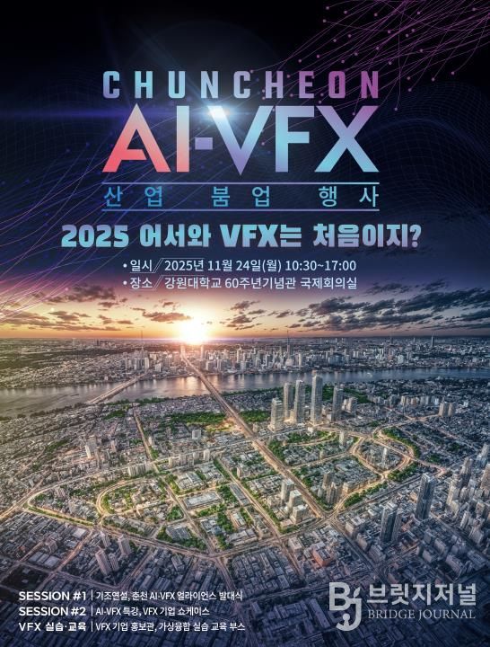 브릿지저널 윤나영 기자 | 춘천시는 2025년 11월 24일 강원대학교 60주년 기념관 국제 회의실에서 ‘춘천 AI-VFX 산업붐업행사 – 2025 어서와! VFX는 처음이지?’를 개최한다고 밝혔다.