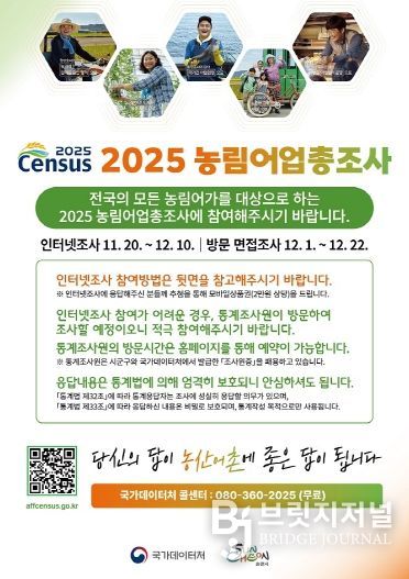 브릿지저널 김경미 기자 | 순천시는 11월 20일부터 12월 22일까지 ‘2025 농림어업총조사’를 본격 추진한다고 밝혔다.