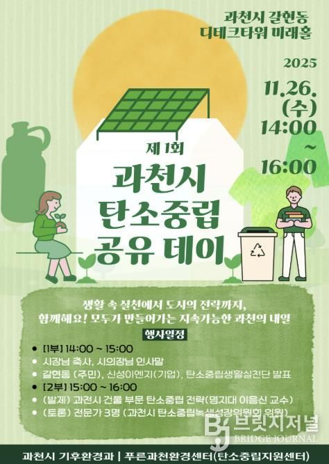 브릿지저널 김경미 기자 | 과천시는 오는 26일 갈현동 디테크타워 미래홀에서 ‘2025년 과천시 탄소중립 공유데이’를 개최한다고 20일 밝혔다.