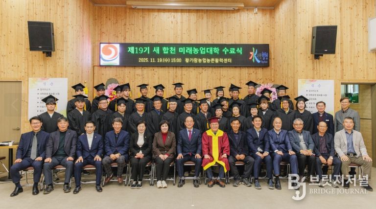브릿지저널 김경미 기자 | 합천군은 11월 19일 황가람 농업농촌활력센터에서 제19기 새 합천 미래농업대학 수료식을 개최했다. 행사에는 수료생과 기관·단체장 등 63명이 참석해 지난 9개월간의 교육 성과를 함께 축하했다.
