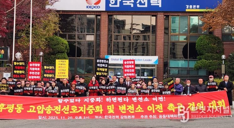 브릿지저널 윤나영 기자 | 박기영 강원특별자치도의원이 11월 20일 후평동 한국전력 강원본부 앞에서 ‘후평동 고압송전선로 지중화 및 변전소 이전 촉구 결의대회’를 개최했다.