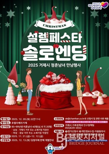 거제시는 “연말 감성을 담아 청년들이 부담 없이 교류할 수 있는 자리가 되도록 세밀하게 준비 중”이라며, “이번 행사가 새로운 인연을 찾는 기회가 되고, 지역사회에도 긍정적인 활기를 더하길 바란다”고 말했다.