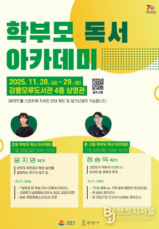 브릿지저널 윤나영 기자 | 강릉시립도서관은 오는 28일과 29일 양일에 걸쳐 강릉모루도서관 4층 상영관에서 ‘학부모 독서 아카데미’를 운영한다.