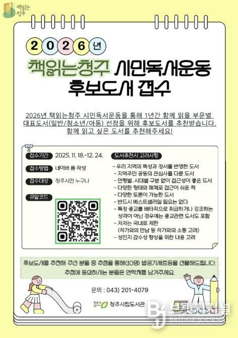 브릿지저널 김경미 기자 | 청주시립도서관은 시민 독서운동 ‘책읽는청주’의 2026년도 대표도서 선정을 위해 오는 12월 24일까지 시민 추천을 접수한다고 21일 밝혔다.