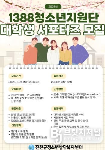 브릿지저널 김경미 기자 | 충북 진천군청소년상담복지센터는 이달 24일부터 대학생 대상 서포터즈 프로그램 ‘2026년 1388청소년지원단 대학생 서포터즈’ 참가자를 모집한다고 밝혔다.