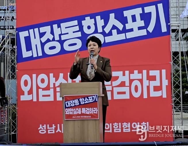 브릿지저널 김경미 기자 | 성남시의회 국민의힘협의회는 20일 오후 4시 성남시 정자역 광장에서 ‘대장동일당 7400억 국고 환수 촉구 및 검찰 항소 포기 외압 규탄대회’를 개최했다.