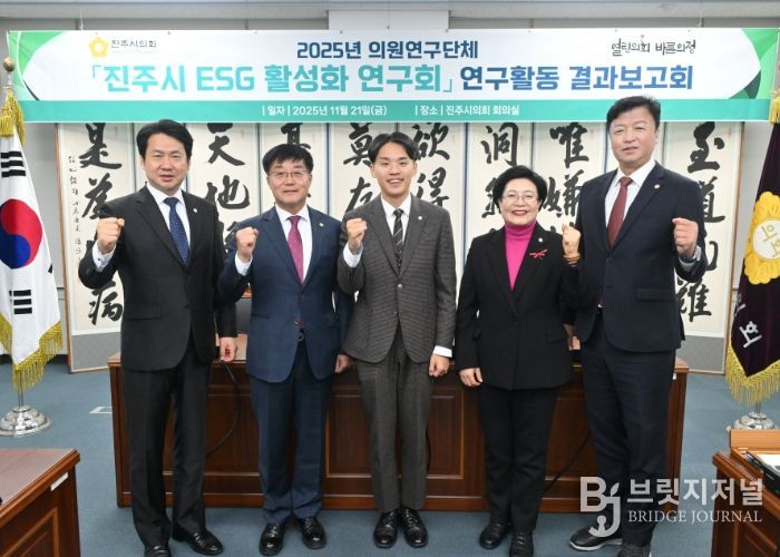 브릿지저널 김경미 기자 | 진주시의회 의원 연구단체 ‘진주시 ESG 활성화 연구회’는 21일 올해 연구활동을 마감하는 결과보고회를 열고, 연간 추진 성과와 향후 정책 제언을 공유했다고 밝혔다.