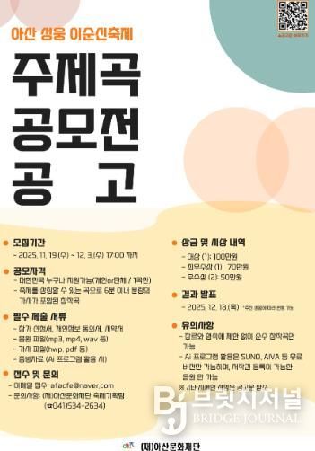 브릿지저널 정보영 기자 | (재)아산문화재단은 '아산 성웅 이순신축제'의 주제곡 공모전을 개최한다고 밝혔다.