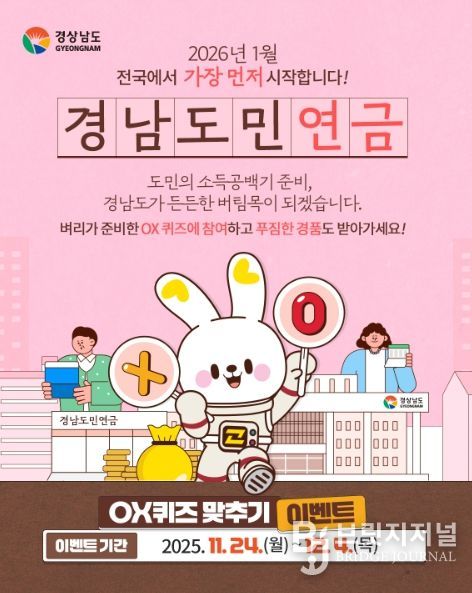 장수환 경상남도 홍보담당관은 “경남도민연금은 도민의 든든한 노후를 위한 새로운 안전망의 첫걸음”이라며, 이번 퀴즈를 통해 핵심 내용을 쉽고 재미있게 접하길 바란다”고 말했다. 이어 “퇴직 후 소득 공백기에 도민들이 안정적인 생활을 이어갈 수 있도록 경남도민연금에 많은 관심과 참여를 부탁드린다”고 덧붙였다.